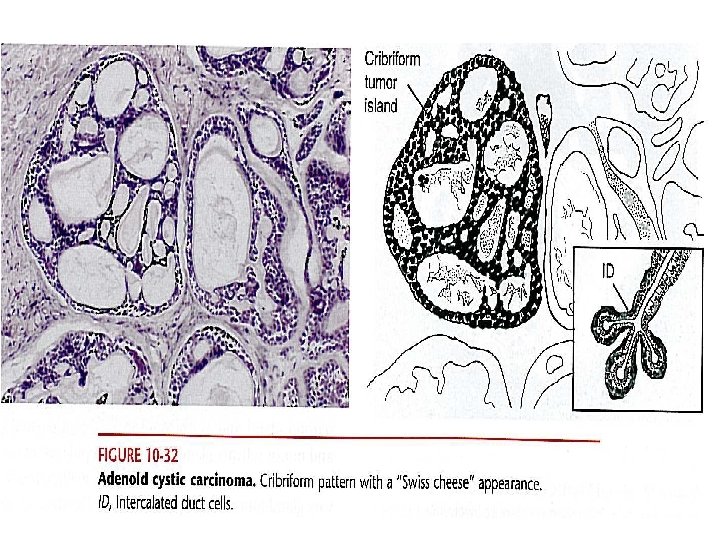 Histopathological features of Adenoid cystic carcinoma Composed of mixture of myoepithelial cells and ductal cells. That have varied arrangement. Three major patterns are recognized: 1. Cribriform 2. Tubular 3. solid Adenoid cystic carcinoma. The small darkly staining cells of the adenoid cystic carcinoma form cribriform islands with large holes which have been likened, rather inappropriately, to