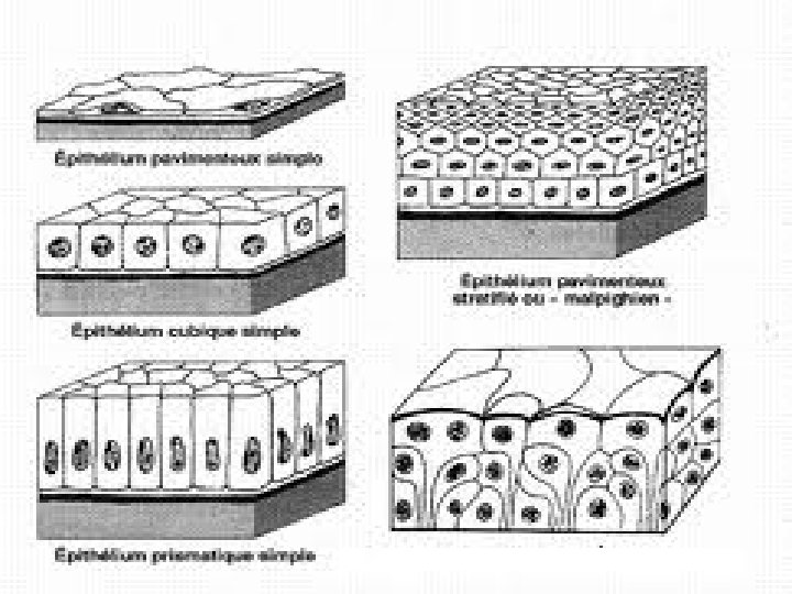 A-forme des cellules: 1)cellules pavimenteuses: plates, polygonales à contour irrégulier, possédant un noyau 2)cellules cubiques: 3)cellules prismatiques ou cylindriques:
