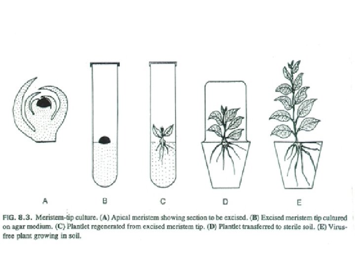 Micropropagation • The art and science of plant multiplication in vitro • Usually derived from meristems (or vegetative buds) without a callus stage – Tends to reduce or eliminate somaclonal variation, resulting in true clones • Can be derived from other explant or callus (but these are often problematic)