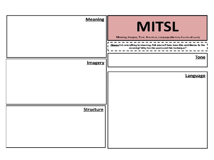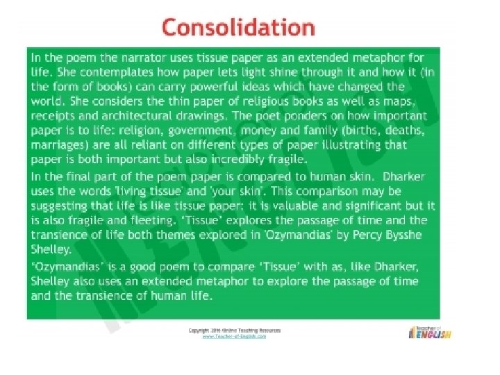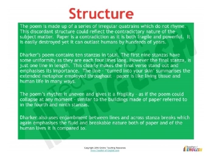 Are we coming to the ‘point’ of the poem now? What is this word again? Why has she used it here? Notice similarities again? In which verse does this feature? What links can you make? with living tissue, raise a structure never meant to last, of paper smoothed and stroked and thinned to be transparent, Whose skin? turned into your skin. What is happening in this verse? This is the only line on its own. Why? Meaning Tone Imagery Structure Language