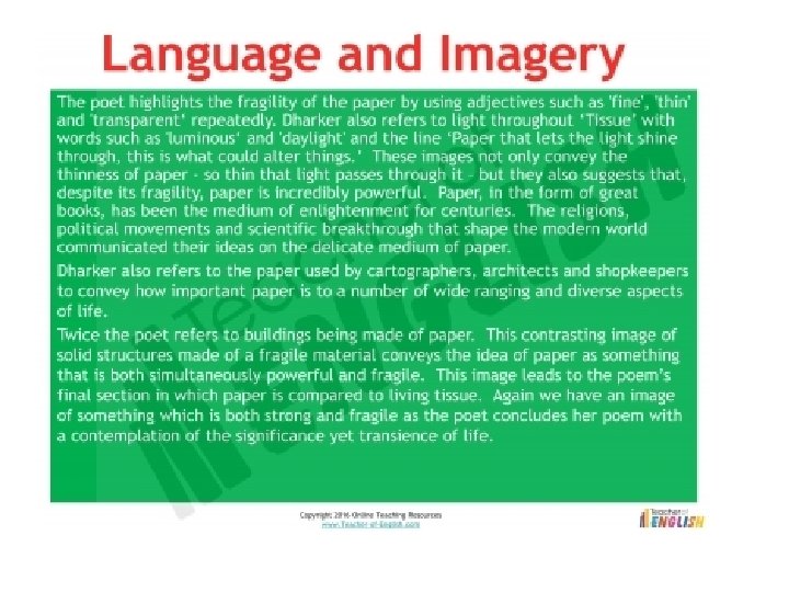 Do you think the word paper is capitalised just because it’s at the start of a sentence? Why might the paper ‘let’ the light through? What paper is she talking about? Paper that lets the light shine through, this is what could alter things. Paper thinned by age or touching, What sort of verb is this called? Why does she use this type? What sort of paper might be thinned this way? What is happening in this verse? Meaning Tone Imagery Structure Language