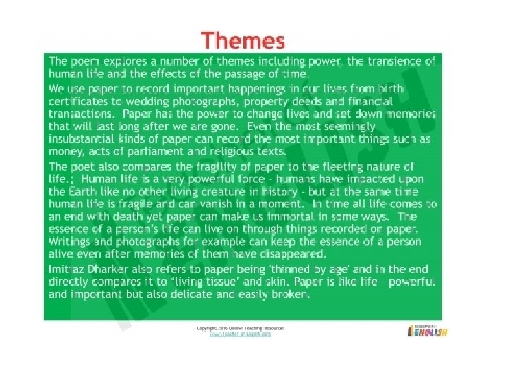 Possible themes What sort of ideas does Dharker seem interested in? Highlight lines, words and phrases that suggest: • Lives beginning, being lived and ending • Structures, countries, borders and features of the landscape Now, get another two different colours. Mark sections of the poem that relate to: • Solidity and certainty • Change and impermanence