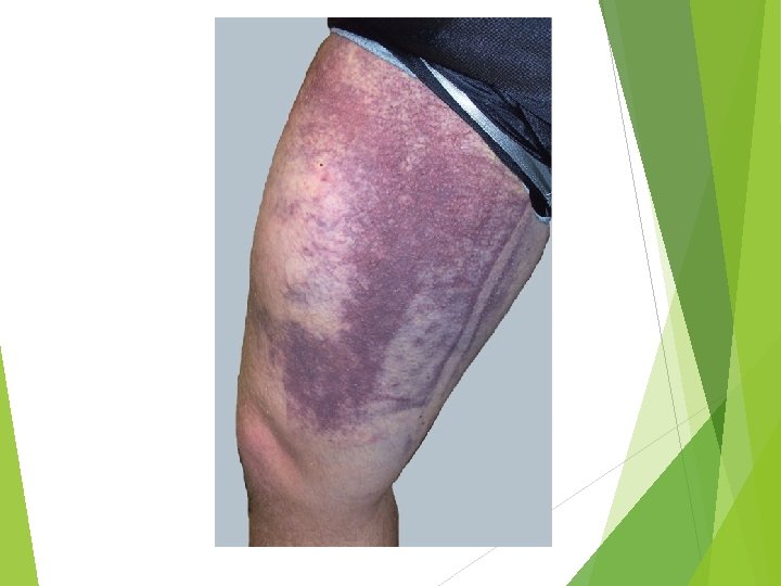 Contusions Result of sudden blow to body Can be both deep and superficial Hematoma results from blood and lymph flow into surrounding tissue Localization of extravasated blood into clot, encapsulated by connective tissue Speed of healing dependent on the extent of damage Chronically inflamed and contused tissue may result in generation of calcium deposits (myositis ossificans) Prevention through protection of contused area with padding
