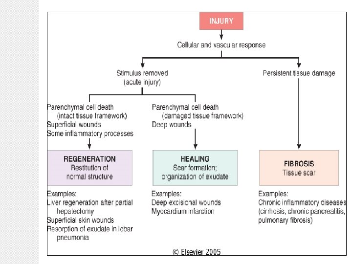 Regeneration of injured cells by cells of same type, for example regeneration of skin/oral mucosa Replacement by fibrous tissue (fibroplasia, scar formation) Both require cell growth, differentiation, and cell-matrix interaction