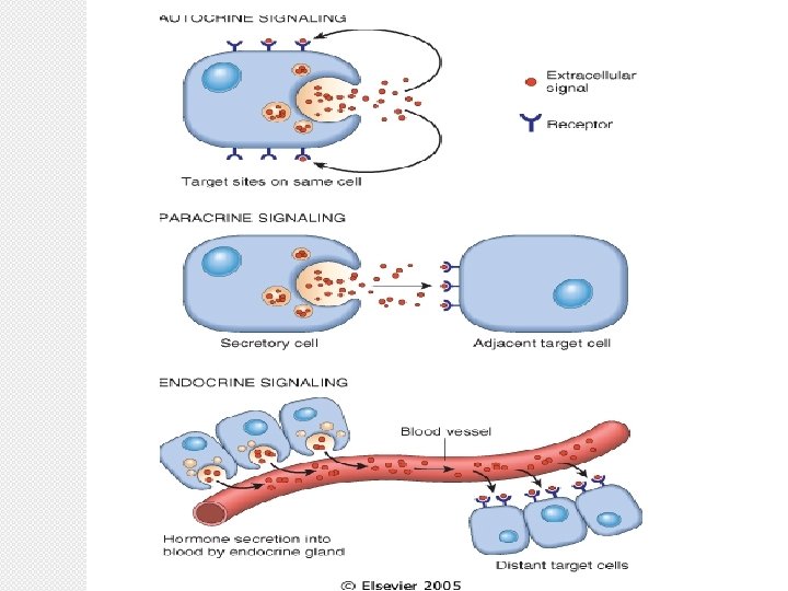 Cell Signaling Patterns �Autocrine = ligand is secreted and detected by same cell �Paracrine = ligand is secreted and separately detected by neighboring cells �Endocrine = ligands (usually hormones) are secreted into the vasculature to affect distant target cells