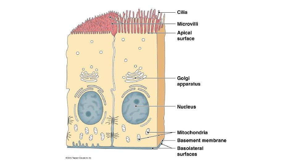 Characteristics of Epithelial Tissue § Cells have polarity ü ü Apical (upper, free) Basal (lower, attached) ØApical surfaces may bear • • Microvilli (e. g. , brush border of intestinal lining) Cilia (e. g. , lining of trachea)