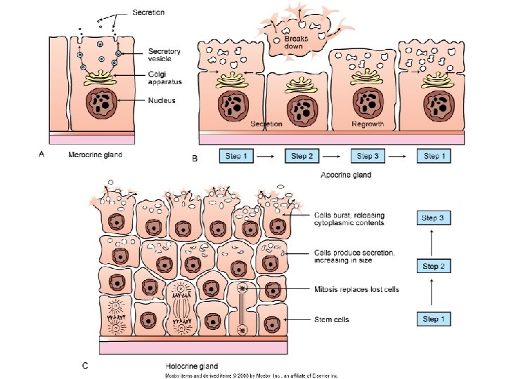 Classification of Exocrine Glands: Manner of Secretion ________ Cells package their secretions and release them as they are manufactured Cell remains intact Majority of glands ________ Cells store their secretions in the apex after they are manufactured. When apex is full, it is pinched off and released with the secretions into the duct system. Cell is repaired and process is repeated. ________ Cells store their secretions until they are needed. The cell lyses, releasing its contents. Cell dies and is replaced via mitosis.