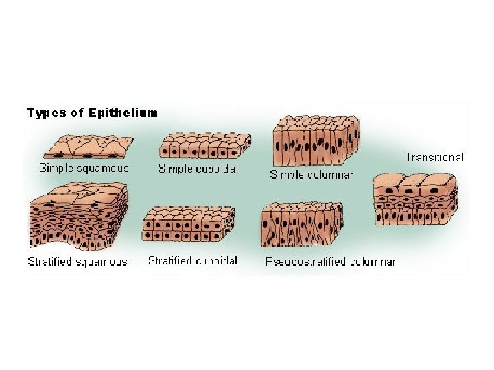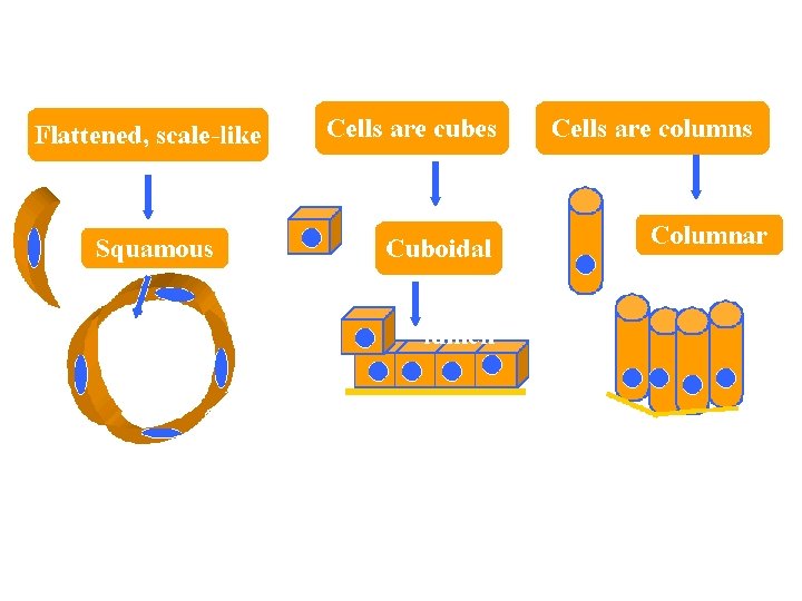 epithelial • Classified by shape of cell – Squamous-flat, scale-like – Cuboidal-same height and width – Columnar-taller than they are wide