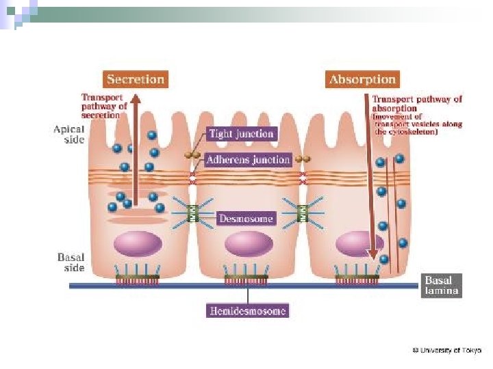 Cell Junctions n Tight junctions ¨ n Adherens junctions ¨ n So close that are sometimes impermeable Transmembrane linker proteins Desmosomes Anchoring junctions ¨ Filaments anchor to the opposite side ¨ n Gap junctions ¨ Allow small molecules to move between cells