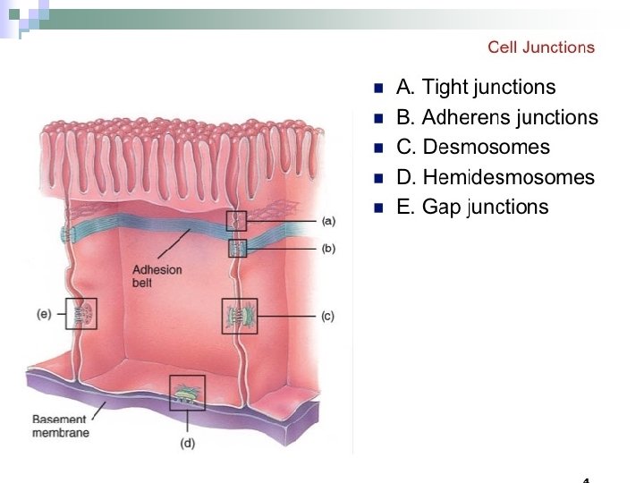 Epithelial surface features n Lateral surface ¨ Adhesion proteins ¨ Tongue and groove wavy contours ¨ Cell junctions: see next slide n Basal surface ¨ Basal lamina: noncellular sheet of protein together with reticular fibers form basement membrane n Apical surface