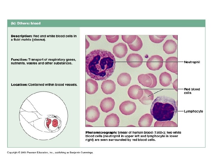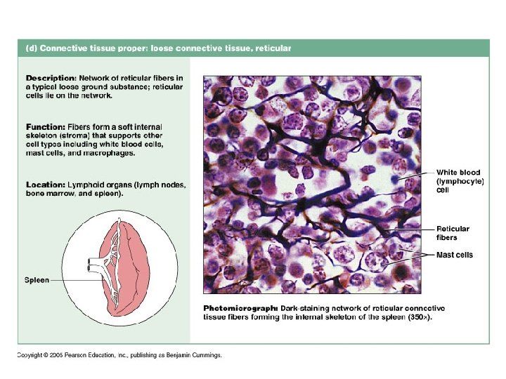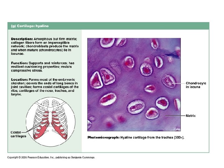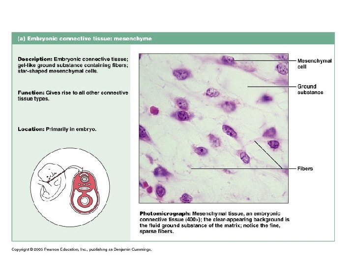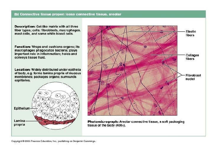 Connective Tissue n n Originate from embryonic tissue called mesenchyme Most diverse and abundant type of tissue Many subclasses (see previous slide) Function: to protect, support and bind together other tissues ¨ Bones, ligaments, tendons ¨ Areolar cushions; adipose insulates and is food source ¨ Blood cells replenished; body tissues repaired n Cells separated from one another by large amount of nonliving extracellular matrix