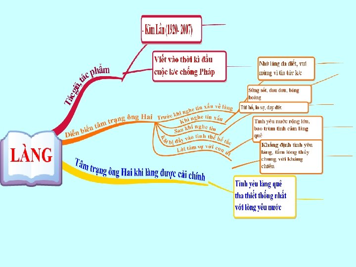 Tiết 62 III. Tổng kết LÀNG -Kim Lân- 1. Miêu tả tâm lí nhân vật cụ thể, tinh tế, sâu sắc. Nghệ thuật 2. Ngôn ngữ nhân vật giàu tính khẩu ngữ. 3. Xây dựng cốt truyện đơn giản, tình huống truyện độc đáo, gay cấn. 1. Thể hiện chân thực, cảm động tình yêu làng, yêu nước tha thiết của ông Hai Nội dung 2. Thể hiện tinh thần kháng chiến của người nông dân phải rời làng đi tản cư