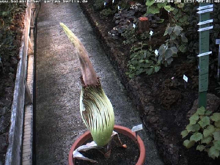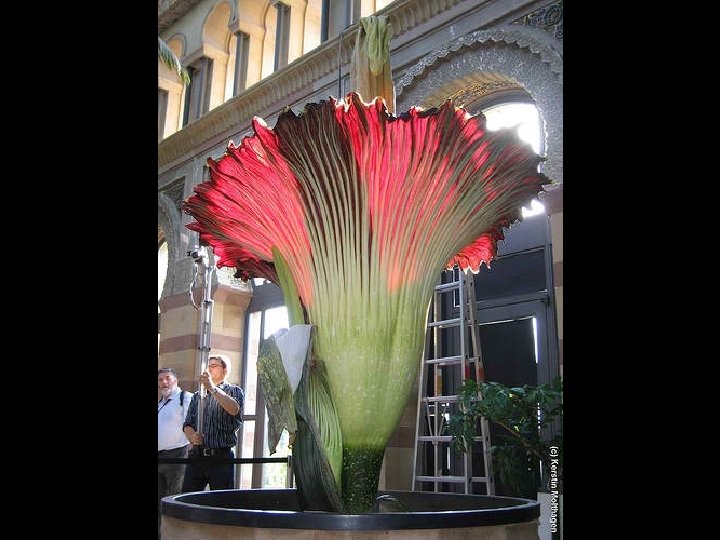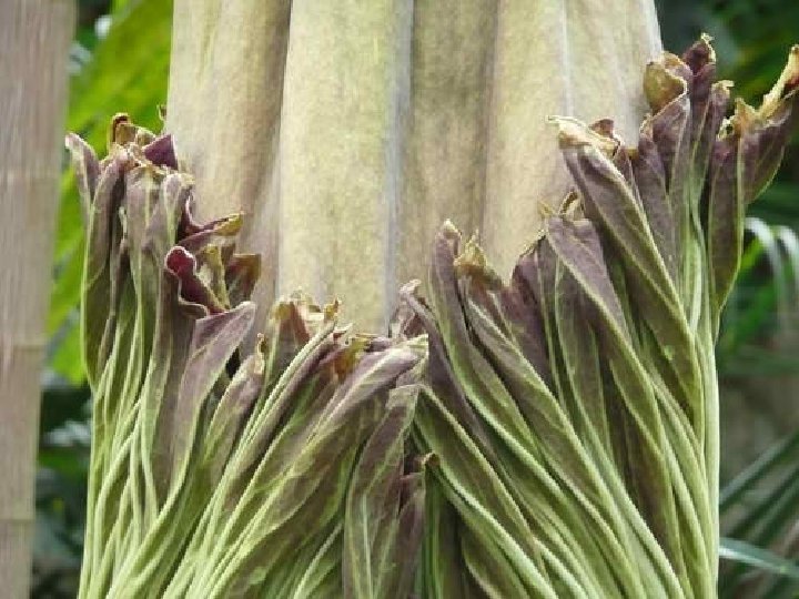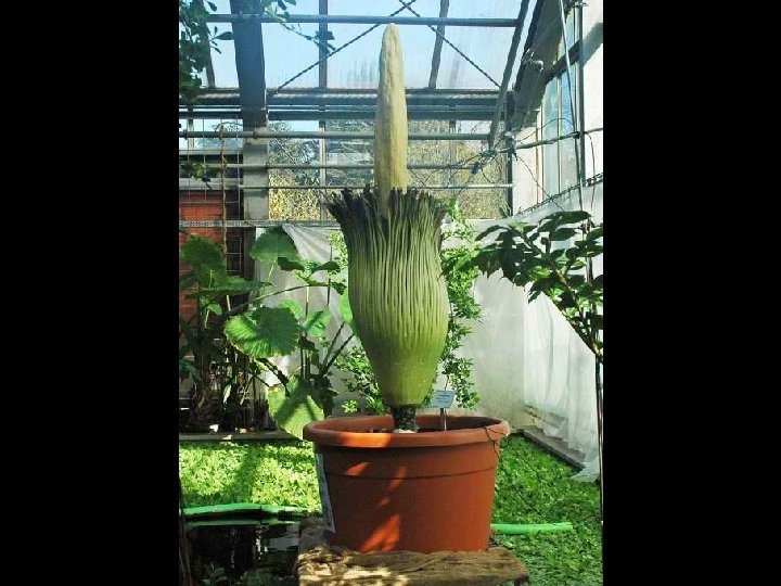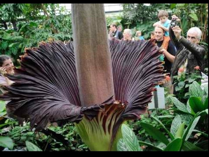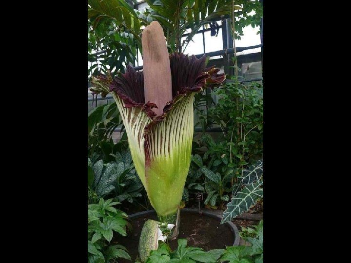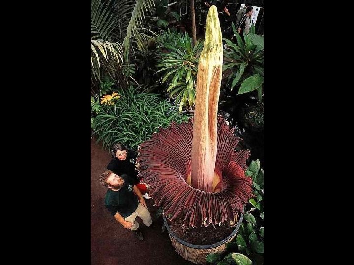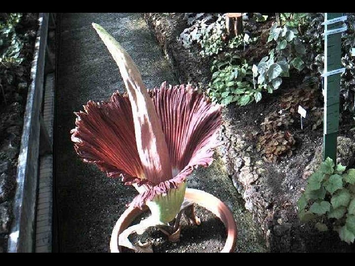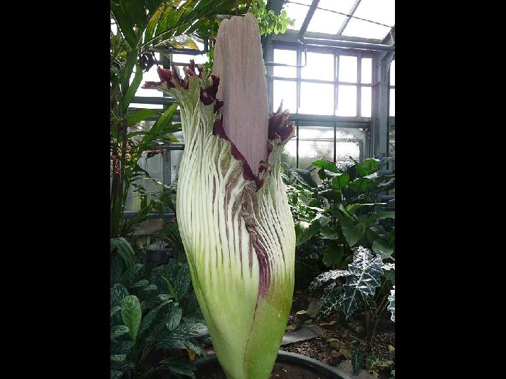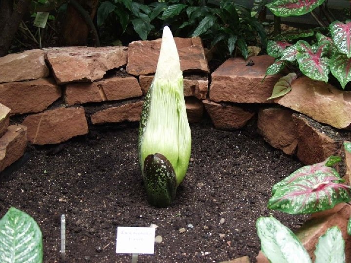 Amorphophallus titanum (from Ancient Greek amorphos, "without form, misshapen" + phallos, "phallus", and titan, "giant" ), known as the titan arum, is a flowering plant with the largest unbranched inflorescence in the world. The titan arum grows in the wild only in the equatorial rainforests of Sumatra, Indonesia. Due to its odor, which is reminiscent of the smell of a decomposing mammal, the titan arum is characterized as a carrion flower.