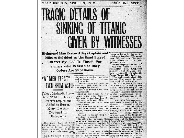 Newspaper Task Your task is to write a newspaper article as if the Titanic has just sunk. Remember to follow the language, structure and layout conventions of newspaper articles. Before you start read the following ‘real-life’ witness accounts of the Titanic sinking – you could use them as eyewitness quotes in your newspaper article. . .