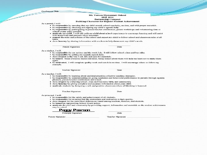 Parent-School Compact Every Title I School has a Compact. It is an agreement between the parent, student, and school to encourage the highest student achievement Please review and sign your child’s Compact, then return it to your child’s teacher. During conferences the teachers will review the compact and request your signature.