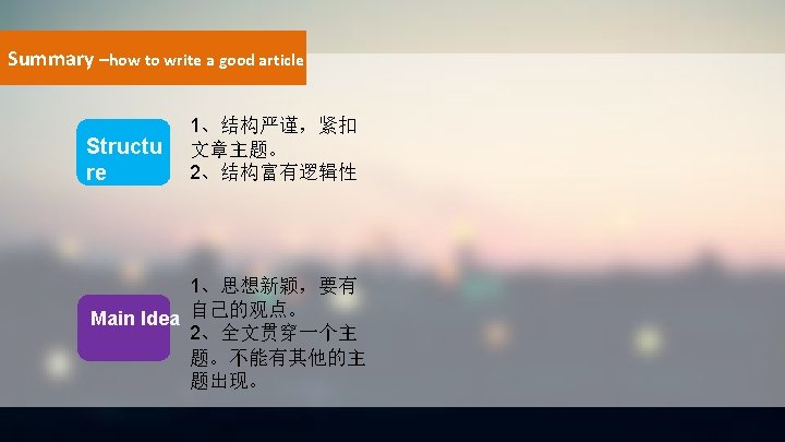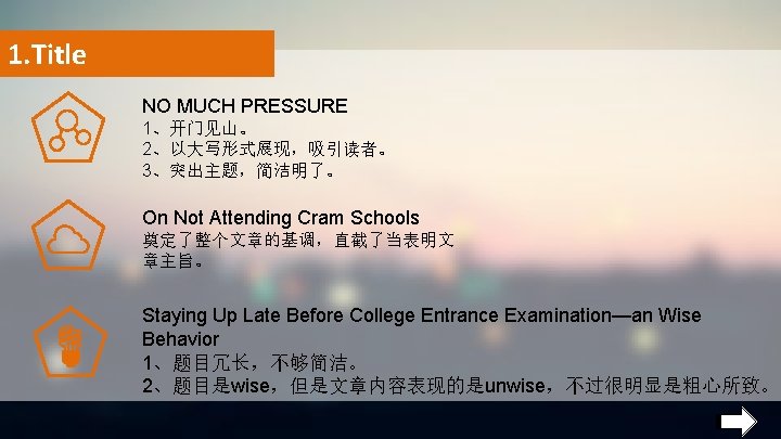 4. Conclusion 结尾形式新颖,紧扣主题. Students are busy, which doesn’t mean they are p roductive; students are leisure, which doesn’t mea n they are lazy, insufficient sleep can erode your l earning capacity. You’d better pay more attention to your sleep, and combine exertion and rest to ex plore the first-rank way of learning. 紧扣主旨,升华主题。充分体现了充足的睡眠对 于高考的重要性。用两句平行句students are busy 和students are leisure总结全文,并且升华主题。