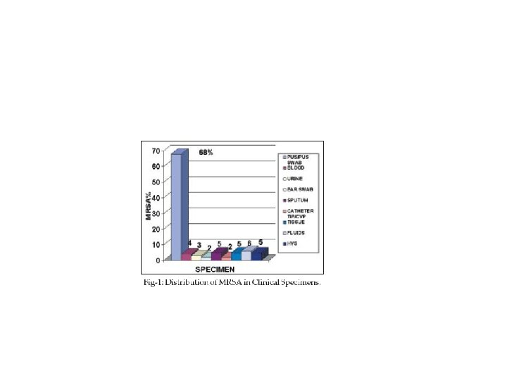 RESULTS Out of 238 staphylococcal cultures recovered from different clinical samples of pus, tissue, body fluids, blood, sputum, urine, catheter tips and tubes during June 2005 to September 2005 from hospitalized patients within 72 hours of their admission in Military Hospitals Rawalpindi. One hundred (42. 01%) were found to be Methicillin resistant. The distribution of MRSA in different clinical samples is shown in Figure-1. Most of the MRSA (68%) were isolated from pus.