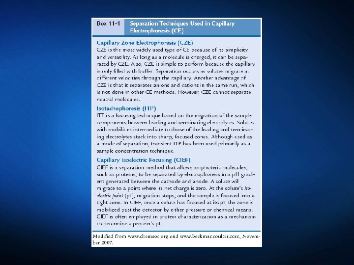 Capillary Electrophoresis The classic separation techniques of zone electrophoresis, isotachophoresis, isoelectric focusing, and gel electrophoresis are performed in a smallbore, fused-silica capillary tube. This method is efficient, sensitive, and rapid.