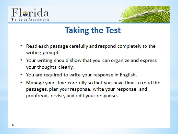 * Tentative Window: May 1 -16 • • Grades 7 -10 Computer-based Contains 56 -66 items Administered in two sessions; completed over two days. • • Grades 6– 8 students will have 85 minutes for each session. Grades 9– 10 students will have 90 minutes for each session. • If student does not complete all Reading and Writing sessions, he/she will NOT receive an FSA ELA score. • The test is composed of Reading Comprehension, Grammar, and Listening skills. 17