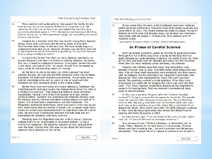 FSA ELA READING Based on a text set, students will be required to answer multiple questions in different formats. 2. This question has two parts. First, answer Part A. Then, answer Part B. Part A Which sentence states a theme of Passage 1? A Hard work pays off in the end. B Country life is better than city life. C Employers must treat workers with respect. D It is important to consider both sides of an argument. For example a text set directs: Read the passages “The Spirit of Discontent” and "The Mill Girls, " listen to the audio clip “The Spirit of Discontent, ” and then answer Numbers 1 through 7. Part B Fill in the circles before two sentences that support the answer in Part A A “And so, Ellen, ” said I, “you think it unpleasant to rise so early in the morning, and be confined in the noisy mill so many hours in the day. B And I think so, too. C All this, and much more, is very annoying, no doubt. D But we must not forget that there advantages, as well as disadvantages, in this employment, as in every other. E If we expect to find all sun-shine and flowers in any station in life, we shall most surely be disappointed. F We are very busily engaged during the day; but then we have the evening to ourselves, with no one to dictate to or control us. G I have frequently heard you say that you would not be confined to house-hold duties and that you disliked the millinery business altogether, because you could not have your evenings for leisure. H You know that in Lowell we have schools, lectures, and meetings of every description, for moral and intellectual improvement. ”
