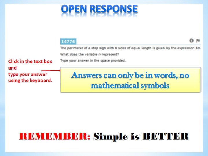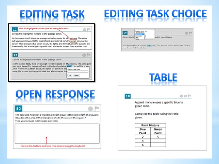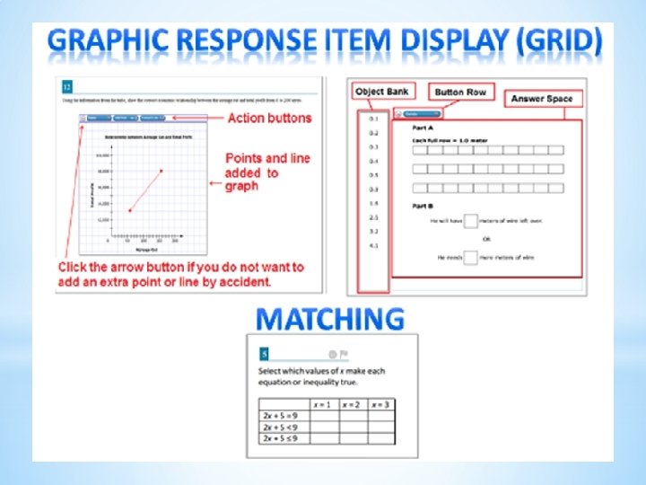* Tentative Window: 6 -8 May 6 -21 EOC Algebra 1 and Geometry 20 -21 * Grades 6 -8, unless enrolled in EOC course * Computer-based * Contains 56 -66 items * Administered in three 60 minute sessions over two days. * Technology Enhanced Items * Hot text, drag and drop, open response, multi-select, graphic response item display, equation editor, matching, table. * Grade 6 not permitted to use calculators. * Grade 7 and 8 may only use calculators for Sessions 2 and 3. * Work folders are provided for students to work out problems.