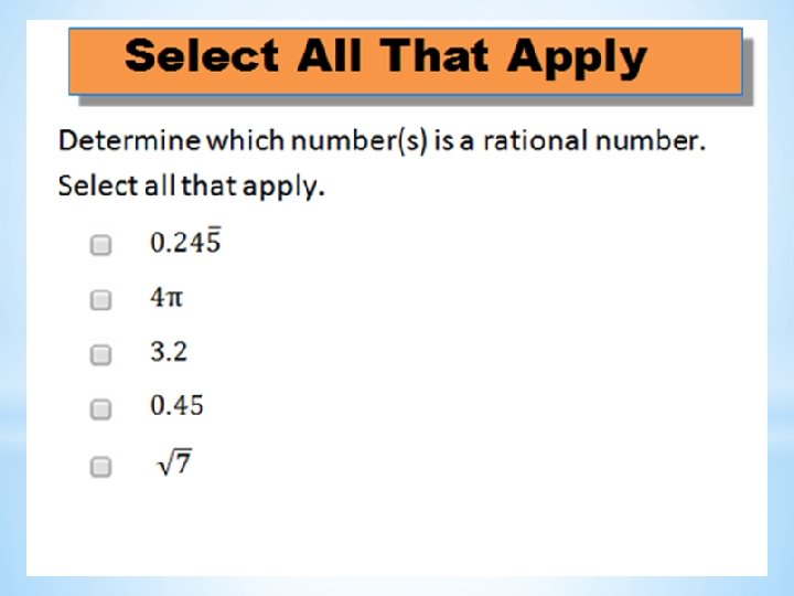 MULTI-SELECT • Multi select items are worth one point. • Multi select items do not have partial credit. • “Select all” from either 5, 6, or 7 responses to choose all correct answers. REMEMBER: Select ALL correct answers to • Read all responses receive credit for the item.