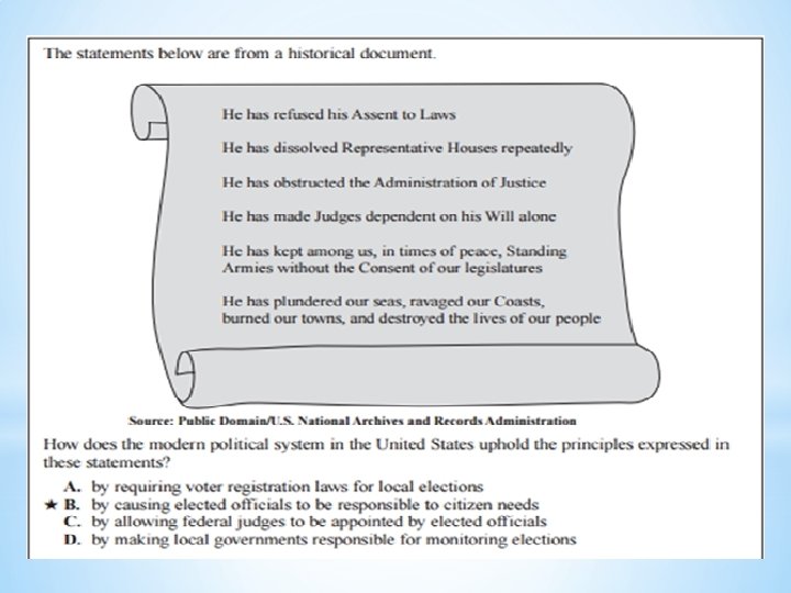 Civics EOC Test Specifications • Standard 1: Demonstrate an understanding of the origins and purposes of government, law, and the American political system. • Standard 2: Evaluate the roles, rights, and responsibilities of U. S. citizens, and determine methods of active participation in society, government, and the political system. • Standard 3: Demonstrate an understanding of the principles, functions, and organization of government. • Standard 4: Demonstrate an understanding of contemporary issues in world affairs, and evaluate the role and impact of U. S. foreign policy.