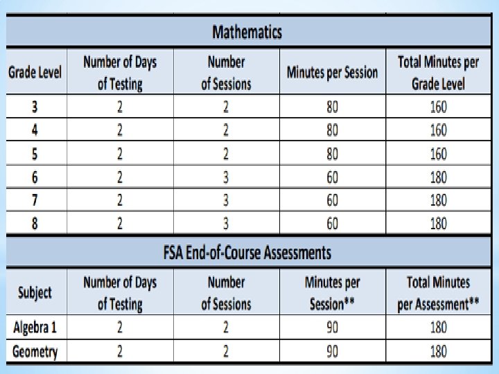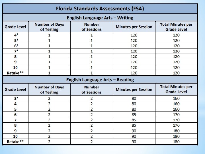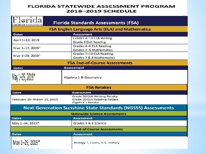 * * Can be FSA or NGSSS * Required for students enrolled in the following EOC courses only: * Civics (7 th) * U. S. History (11 th) * Biology * Algebra I (graduation requirement—must pass with a Level 3) * Geometry * All EOCs are worth 30% of the student’s final grade in the course.