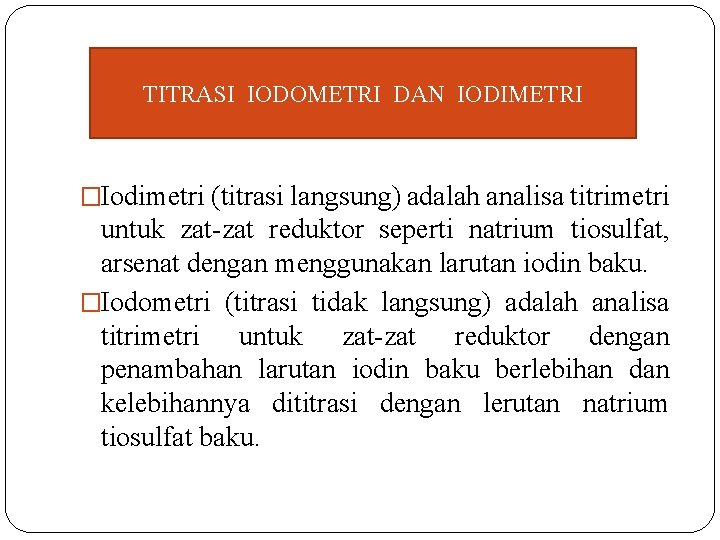 TITRASI IODOMETRI DAN IODIMETRI �Iodimetri (titrasi langsung) adalah analisa titrimetri untuk zat-zat reduktor seperti natrium tiosulfat, arsenat dengan menggunakan larutan iodin baku. �Iodometri (titrasi tidak langsung) adalah analisa titrimetri untuk zat-zat reduktor dengan penambahan larutan iodin baku berlebihan dan kelebihannya dititrasi dengan lerutan natrium tiosulfat baku.