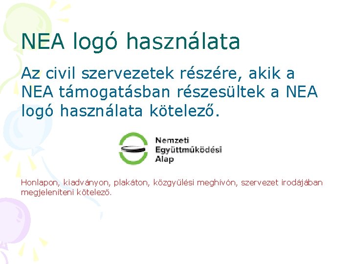 NEA logó használata Az civil szervezetek részére, akik a NEA támogatásban részesültek a NEA logó használata kötelező. Honlapon, kiadványon, plakáton, közgyűlési meghívón, szervezet irodájában megjeleníteni kötelező.