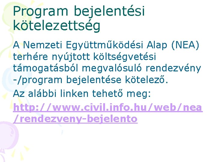 Program bejelentési kötelezettség A Nemzeti Együttműködési Alap (NEA) terhére nyújtott költségvetési támogatásból megvalósuló rendezvény -/program bejelentése kötelező. Az alábbi linken tehető meg: http: //www. civil. info. hu/web/nea /rendezveny-bejelento