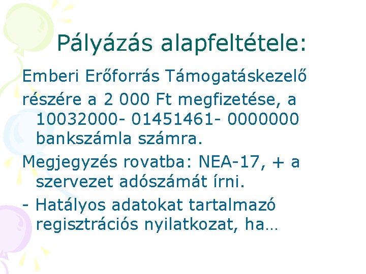 Pályázás alapfeltétele: Emberi Erőforrás Támogatáskezelő részére a 2 000 Ft megfizetése, a 10032000 - 01451461 - 0000000 bankszámla számra. Megjegyzés rovatba: NEA-17, + a szervezet adószámát írni. - Hatályos adatokat tartalmazó regisztrációs nyilatkozat, ha…