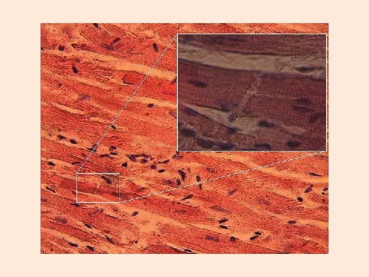 Mięsień sercowy Tworzą go jednojądrzaste komórki, łączące się w szeregi poprzez złącza przyjmujące postać tzw. wstawek. wstawki mają postać prostej lub schodkowej ciemnej linii w poprzek szeregu komórek sercowych. Widoczne są strefy przylegania (zonula adherens), desmosomy i połączenia szczelinowe (nexus). Mają one za zadanie: • silnie złączyć komórki, • wytworzyć sprzężenie czynnościowe (nexus). Struktura włókienek mięśniowych i sarkomerów nie różni się od mięśnia szkieletowego. Istnieje również system kanalików poprzecznych T, chociaż są one liczniejsze i większe. Cysterny siateczki sarkoplazmatycznej tworzą nie triady a diady. W sarkoplazmie widoczne są bardzo liczne mitochondria a także jądra komórkowe.