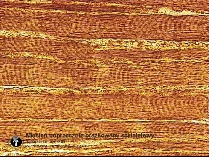 • Na przekroju podłużnym włókna mięśniowego widać pod sarkolemą liczne jądra komórkowe, a we wnętrzu sarkoplazmy liczne włókienka mięśniowe (miofibryle, o średnicy 1 -2 µm), ułożone równolegle do siebie • Pomiędzy włókienkami mięśniowymi widać wyst. mitochondria oraz błony gładkiej siateczki sarkoplazmatycznej.