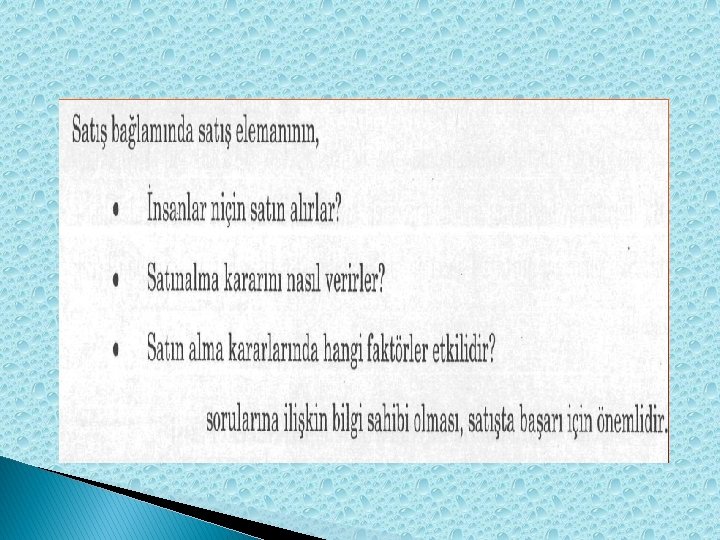 satış elemanının; * İnsanlar niçin satın alır? * Satın alma kararını nasıl verir? * Satın alma kararlarında hangi faktörler etkilidir? Sorularına ilişkin bilgi sahibi olması, satışta başarı için önemlidir.