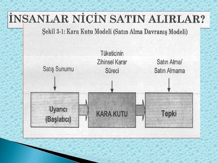 İNSANLAR NİÇİN SATIN ALIRLAR? İnsanların niçin alışveriş yaptıklarını açıklamaya yönelik pazarlama ve tüketici davranışları yazınında çeşitli teoriler ve modeller önerilmektedir. En yaygın model Kara Kutu modeli olarak bilinen uyarıcı‐tepki modelidir. Psikolog Kurt Lewin tarafından geliştirilmiş olan, kara kutu modeline göre tüketici; kara kutu denilen bir sürece giren verilerin kara kutu içerisinde her bireye göre farklı şekillenmesi sonucunda karar vermektedir. Bu süreci deşifre etmek veya görmek mümkün değildir. *Satın alma davranış modeli; Uyarıcı Kara Kutu Tepki