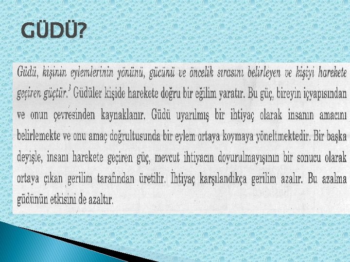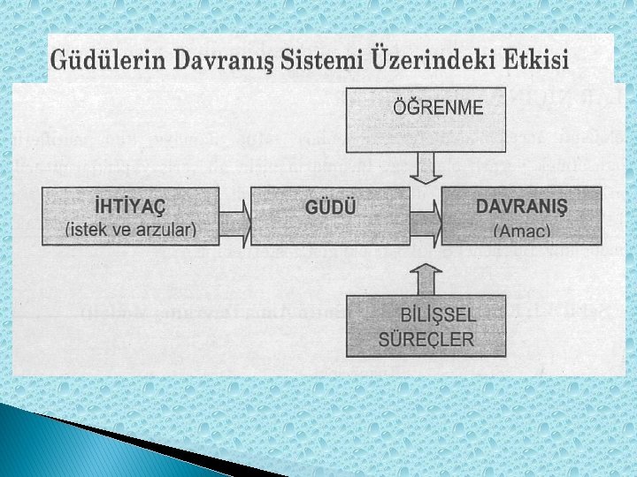 Güdülerin Davranış Sistemi Üzerindeki Etkisi ÖĞRENME İHTİYAÇ (istek ve arzular) DAVRANIŞ (amaç) GÜDÜ BİLİŞSEL SÜREÇLER Güdü, kişinin eylemlerinin yönünü, gücünü ve öncelik sırasını belirleyen ve kişiyi harekete geçiren güçtür.
