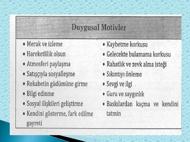Bunlar: � Rasyonel güdüler (yüksek kalite, düşük fiyat, performans) � Duygusal güdüler (başkalarını etkileme, üretkenlik, beğenilme) � Psikolojik güdüler (kendini kanıtlama, farklı olma) � Toplumsal güdüler (takdir edilme, grup üyeliği, saygı görme) Bunun yanında güdüleri fizyolojik ve psikolojik olmak üzere iki grupta toplayanlarda vardır. � Fizyolojik güdüler açlık, susuzluk vb. ihtiyaçlardan kaynaklanır. � Psikolojik güdüler acıma, sevme ve nefret gibi ruhsal eğilimlerden kaynaklanır.