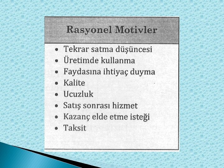 Tüketicileri Satınalmaya İten Duygusal ve Rasyonel Motivler Duygusal Motivler • Merak ve izleme ● Kaybetme korkusu • Hareketlilik olsun ● Gelecekte bulamama korkusu • Atmosferi paylaşma ● Rahatlık ve zevk alma isteği • Satışçıyla sosyalleşme ● Sıkıntıyı önleme • Rekabetin güdümüne girme ● Sevgi ve ilgi • Bilgi edinme ● Guru ve saygınlık • Sosyal ilişkileri geliştirme Baskılardan kaçma ve kendini tatmin • Kendini gösterme, fark edilme Rasyonel Motivler • Tekrar satma düşüncesi • Üretimde kalkınma • Faydasına ihtiyaç duyma • Kalite • Ucuzluk • Satış sonrası hizmet • Kazanç elde etme isteği • Taksit