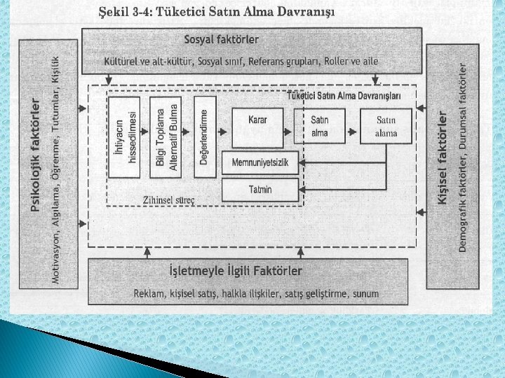 Tüketici Satın Alma Davranışı Zihinsel süreç Tüketici Satın Alma Davranışları karar Satın alma Satın alama memnuniyetsizl ik tatmin İşletmeyle ilgili faktörler Reklam, kişisel satış, halkla ilişkiler, satış geliştirme, sunum Kişisel faktörler Demografik faktörler, durumsal faktörler Bilgi toplama Alternatif bulma Değerlendir me Kültürel ve alt-kültür, sosyal sınıf, refarans grupları, roller ve aile İhtiyacın hissedilmesi PSİKOLOJİK FAKTÖRLER Motivasyon, Algılama, Öğrenme, Tutumlar, Kişilik Sosyal Faktörler