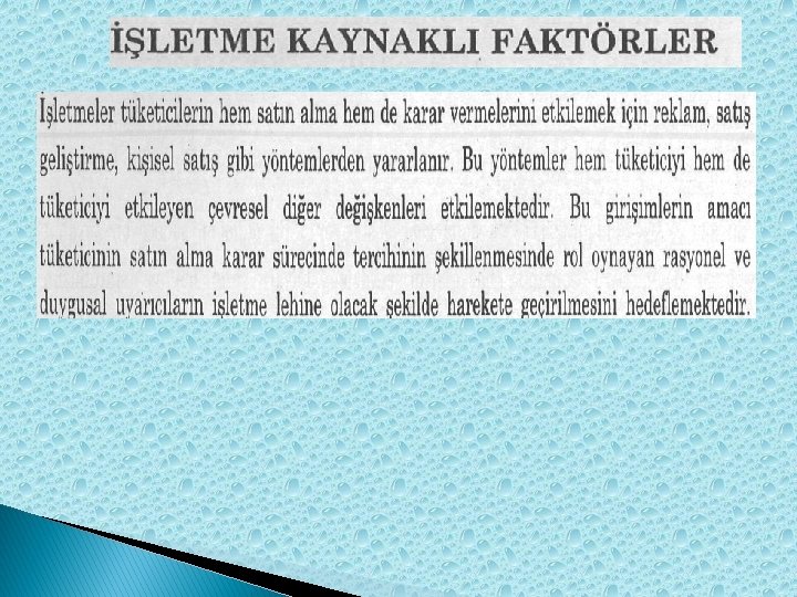İŞLETME KAYNAKLI FAKTÖRLER � İşletmeler tüketicilerin hem satın alma hem de karar vermelerini etkilemek için reklam, satış geliştirme, kişisel satış gibi yöntemlerden yararlanır. Bu yöntemler hem tüketiciyi hem de tüketiciyi etkileyen çevresel diğer değişkenleri etkilemektedir. Bu girişimlerin tercihinin şekillenmesinde rol oynayan rasyonel ve duygusal uyarıcıların işletme lehine olacak şekilde harekete geçirilmesini hedeflemektedir.