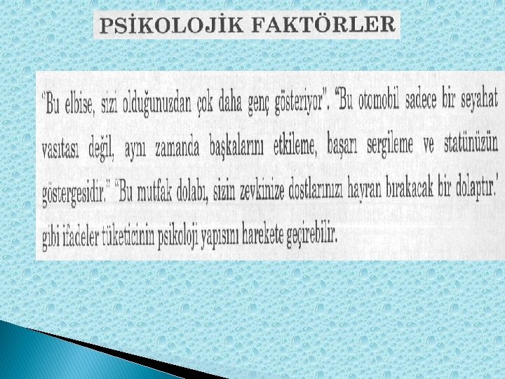 PSİKOLOJİK FAKTÖRLER � Psikolojik faktörler satın alma sürecini derinden etkileyen faktörlerin başında gelmektedirler. Geçmiş tecrübeler, kişilik, tutumlar, inançlar ve algılama en önemli psikolojik faktörler olarak karşımıza çıkmaktadır. Bazı tüketiciler inançları gereği bazı ürünleri satın almamakta ve kullanmamaktadır. Örneğin vejetaryenler et ve et ürünleri yememeyi tercih etmektedirler. � ‘’Bu elbise, sizi olduğunuzdan çok daha genç gösteriyor. Bu otomobil sadece bir seyahat vasıtası değil, aynı zamanda başkalarını etkileme, başarı sergileme ve statünüzün göstergesidir. Bu mutfak dolabı, sizin zevkinize dostlarınızı hayran bırakacak bir dolaptır’’. Bu ve benzeri sözler tüketicinin psikoloji yapısını harekete geçirebilir.