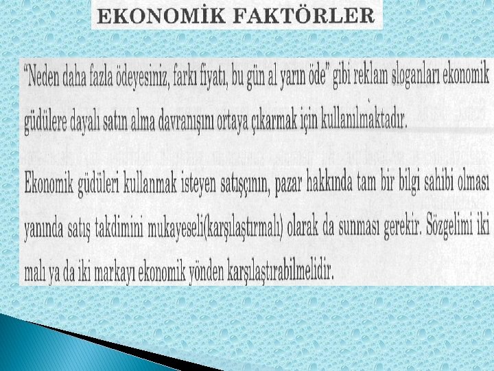 EKONOMİK FAKTÖRLER � Çoğu müşterilerin ihtiyaç gidermesini teşvik eden faktörler, ekonomik faktörlerdir. Özellikle düşük gelir gruplarındaki tüketicilerin ihtiyaç gidermesinde bu faktör ihmal edilmeyecek kadar önemli bir rol oynar. Öte yandan, kâr duygusu ile hareket eden bir esnaf, tüccar, sanayici, bu kriteri önemli bir değerlendirme faktörü olarak görür. � Ekonomik faktör deyince; fiyat, satın alma için gösterilen çaba ve kolaylıklar, fiziksel ve zihinsel enerji, fiyat‐kalite ilişkisi, hizmet, ödeme ve teslim koşulları akla gelir. Satışçı, bu güdüyü değişik biçimlerde kullanabilir. Ancak, bunu yaparken, müşterisinin sadece ekonomik faktörlere göre hareket edeceği konusunda emin olmalıdır.