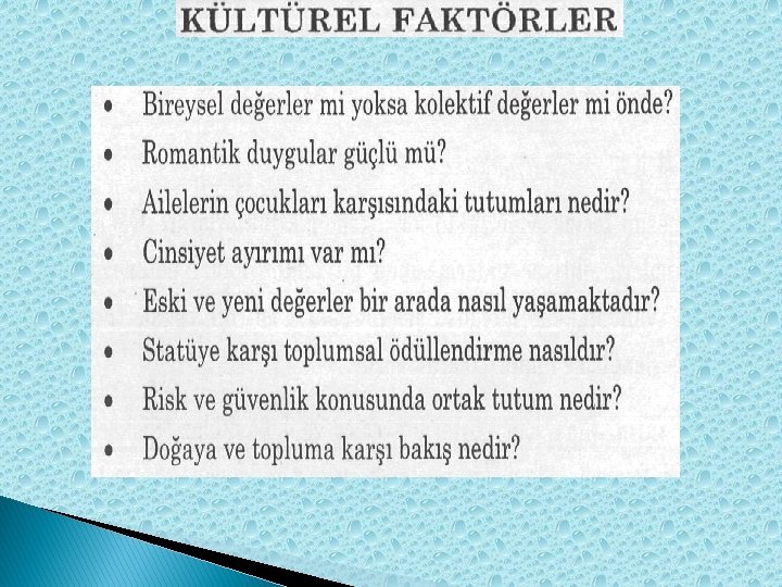 � Bir satışçı, teklifini şu sorulara cevap vererek hazırlamalıdır. · Bireysel değerler mi yoksa kolektif değerler mi önde, · Romantik duygular güçlü mü, · Ailelerin çocukları karşısındaki tutumları nedir, · Cinsiyet ayırımı var mı, · Eski ve yeni değerler bir arada nasıl yaşamaktadır, · Statüye karşı toplumsal ödüllendirme nasıldır, · Risk ve güvenlik konusunda ortak tutum nedir, · Doğaya ve topluma karşı bakış nedir?