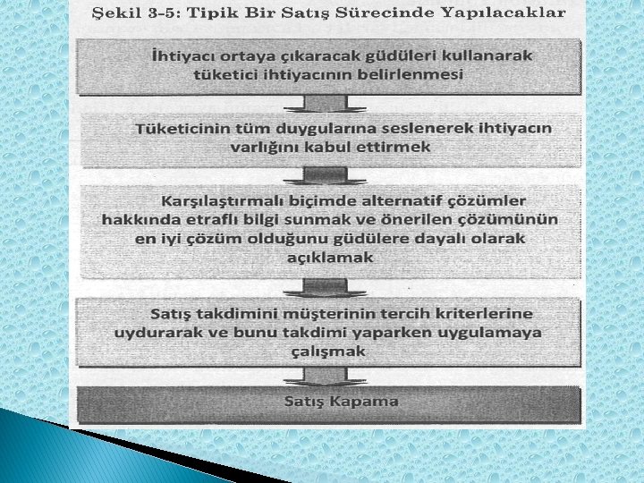 İhtiyacı ortaya çıkaracak güdüleri kullanarak tüketici ihtiyacının belirlenmesi Tüketicinin tüm duygularına seslenerek ihtiyacın varlığını kabul ettirmek Karşılaştırmalı biçimde alternatif çözümler hakkında etraflı bilgi sunmak ve önerilerin çözümünün en iyi çözüm olduğunu güdülere dayalı olarak açıklamak Satış takdimini müşterinin tercih kriterine uydurarak ve bunu takdimi yaparken uygulamaya çalışmak Satış kapama