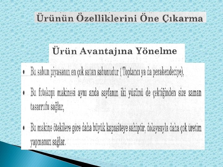 Ürün Avantajına Yönelme � Ürün avantajı, ürüne özelliklerinden farklı bir kavramdır. Ürün avantajı denince, tüketicinin o ürüne sahip olmakla ulaşacağı doyumlar akla gelir. Sözgelimi, bir lisan öğrenme programında, programın basit bir CD çalarla kullanılabileceğini söyleyerek ürünün özelliği vurgulanmış olur. Ama, bu programın müşteriye yabancılarla iletişim kurmada, işini daha başarılı kılmadaki üstünlükleri anlatılırsa, ürüne sahip olmanın ayrıcalıkları ifade edilmiş olur. · Bu sabun piyasanın en çok satan sabunudur ( Toptancı ya da perakendeciye), · Bu fotokopi makinesi aynı anda sayfanın iki yüzünü de çektiğinden size zaman tasarrufu sağlar, · Bu makine ötekilere göre daha büyük kapasiteye sahiptir, dolayısıyla daha çok üretim yapmanızı sağlar.