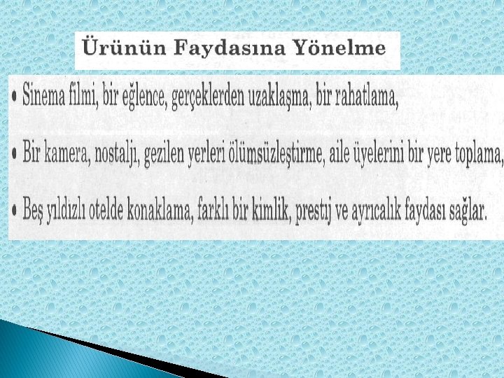 Ürünün Faydasına Yönelme � Fayda, tanımı oldukça zor bir kavramdır. Aynı kişi bir fincan kahveyi bir kıraathanede, denize bakan bir çay bahçesinde, beş yıldızlı bir otelin lobisinde içebilir. Ama, ona göre her birinden elde ettiği fayda farklıdır. O nedenle de içtiği yere bağlı olarak aynı kahveye farklı fiyat öder. Dolayısıyla ürünün faydası geniş bir bakış açısıyla ele alınmalıdır. · Sinema filmi, bir eğlence, gerçeklerden uzaklaşma, bir rahatlama, · Bir kamera, nostalji, gezilen yerleri ölümsüzleştirme, aile üyelerini bir yere toplama, · Beş yıldızlı otelde konaklama, farklı bir kimlik, prestij ve ayrıcalık faydası sağlar.