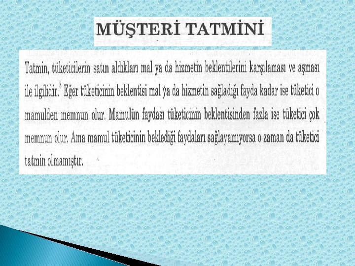 Müşteri Tatmini � Tatmin, tüketicilerin satın aldıkları mal ya da hizmetin beklentilerini karşılaması ile ilgilidir. Eğer tüketicinin beklentisi mal ya da hizmetin sağladığı fayda kadar ise tüketici o mamulden tatmin olur. Mamulün faydası tüketicinin beklentisinden fazla ise tüketici çok memnun olur. Ama mamul tüketicinin beklediği faydaları sağlayamıyorsa o zaman da tüketici tatmin olmamıştır.
