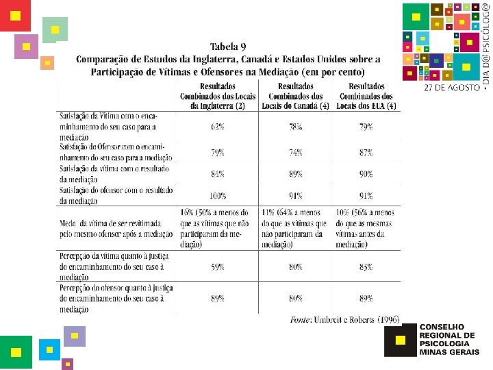 Psicologia e Pacificação Social • O Direito Moderno tem como fim a integração social, o que não quer dizer ausência de agressividade ou conflitos. • Se não fossem as diferenças constitutivas de nossas subjetividades, as ideias de singularidade e de dignidade não existiram, nem mesmo a humanidade. • A pacificação social liga-se a coexistência das diferenças e promoção do respeito e da dignidade mutuamente reconhecidos. • É necessário repensar o Direito Moderno e seu modelo adversarial. • A Psicologia contribui com o Direito apontando caminhos instrumentos para repensar os conflitos como oportunidades, como meios de recomposição de laços sociais e de ferramentas participativas de construção da Justiça.