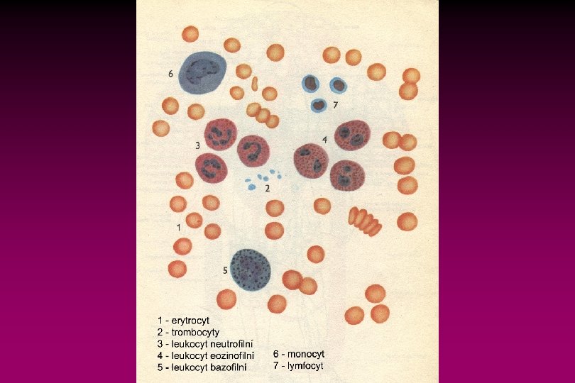 Krevní elementy Červené krvinky - erytrocyty • bezjaderné buňky (7, 2 μm) • obsahují hemoglobin přenášející kyslík (15 -16 g/100 ml) • počet 4 -5 milionů/mm 3 • anemie - chudokrevnost Bílé krvinky – leukocyty (5 -9 tisíc/mm 3) • granulocyty • neutrofilní (50 -70%) • eozinofilní (1 -9%) • bazofilní (0, 5%) • agranulocyty • lymfocyty (20 -40%) • monocyty (2 -8%) Krevní destičky – trombocyty (300. 000/mm 3)